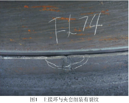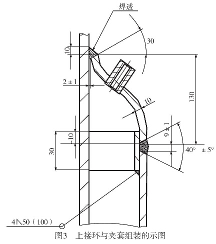 搪玻璃特種設(shè)備的上接環(huán)下接環(huán)與夾套組裝的對接接頭焊接過程、焊接質(zhì)量難以控制,圖1為上接環(huán)與夾套組裝有裂紋;圖2為下接環(huán)與夾套組裝有缺陷;圖3為上接環(huán)與夾套組裝的示意圖。