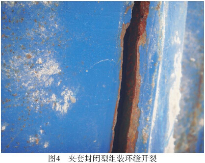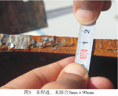 圖4是夾套封閉型組裝環(huán)縫開裂;圖5是搪玻璃特種設(shè)備使用過程中損壞后上接環(huán)與夾套組裝焊縫解剖后14mm的鋼板有Smm×90mm未焊透、未熔合現(xiàn)象。